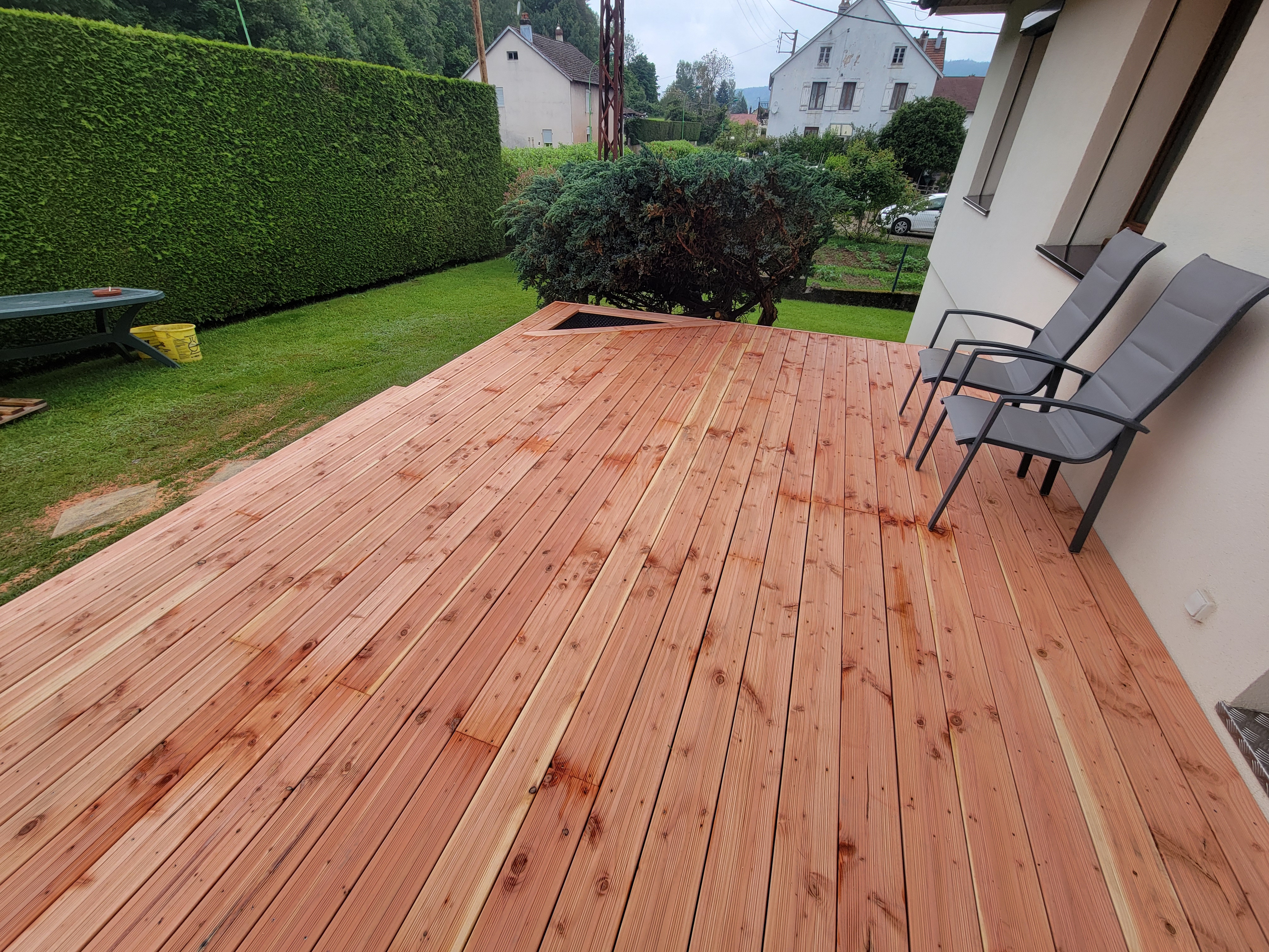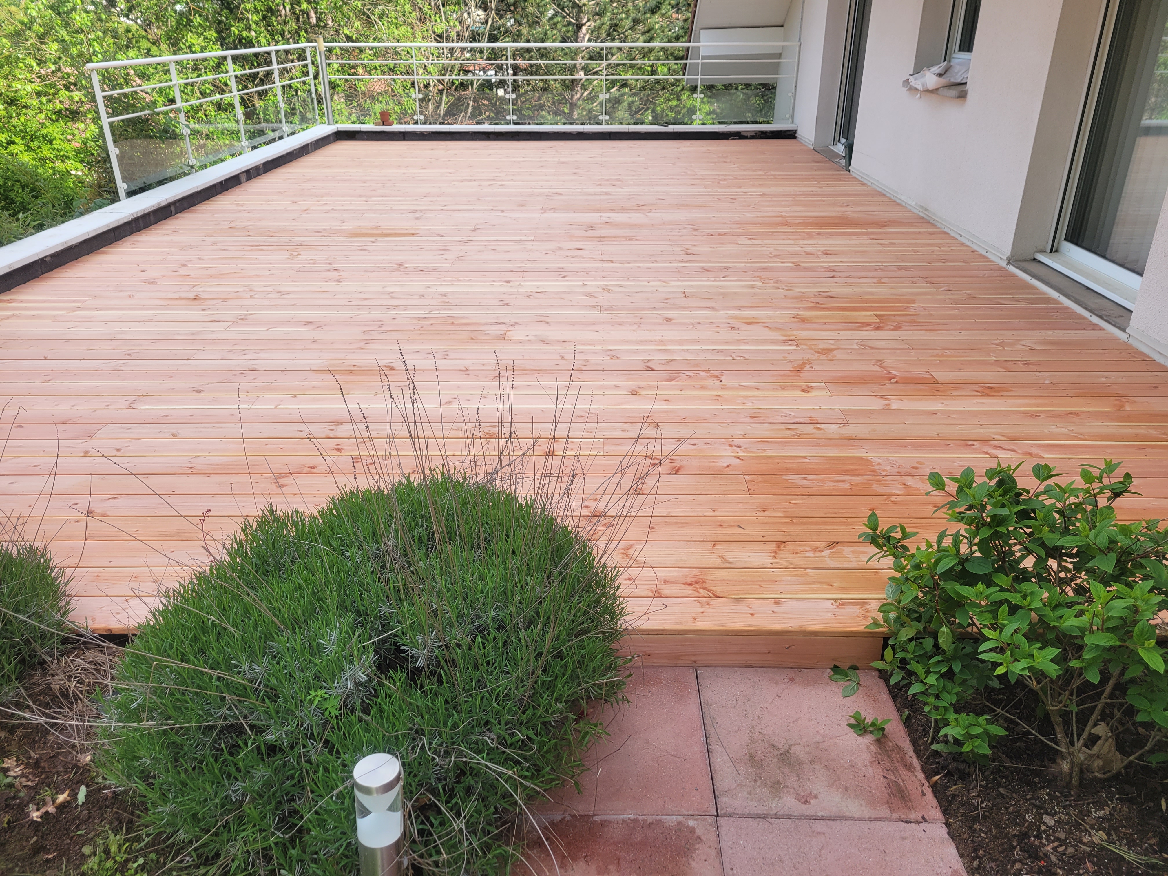Réalisation de vos terrasses sur mesure, avec le bois de votre choix. Sur pilotis ou non avec du bois local (douglas, mélèze, pin autoclave marron…)